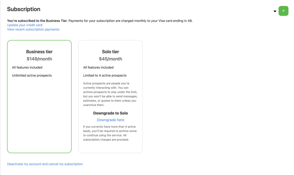 Manage your Quote Cactus subscription, including tier changes, payment methods, and account status.