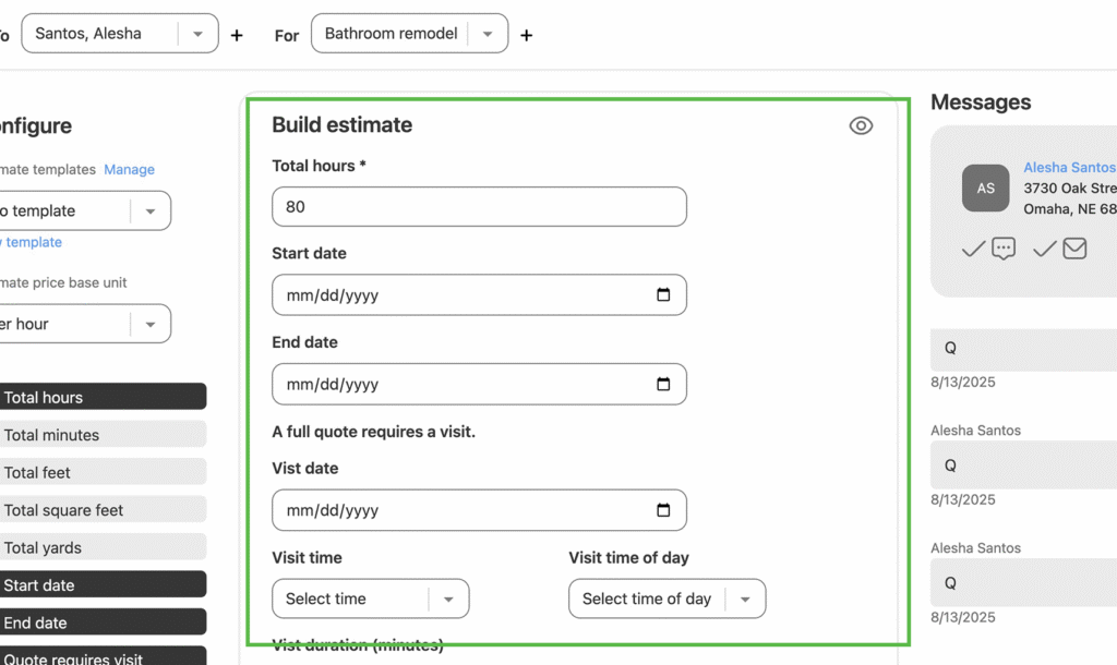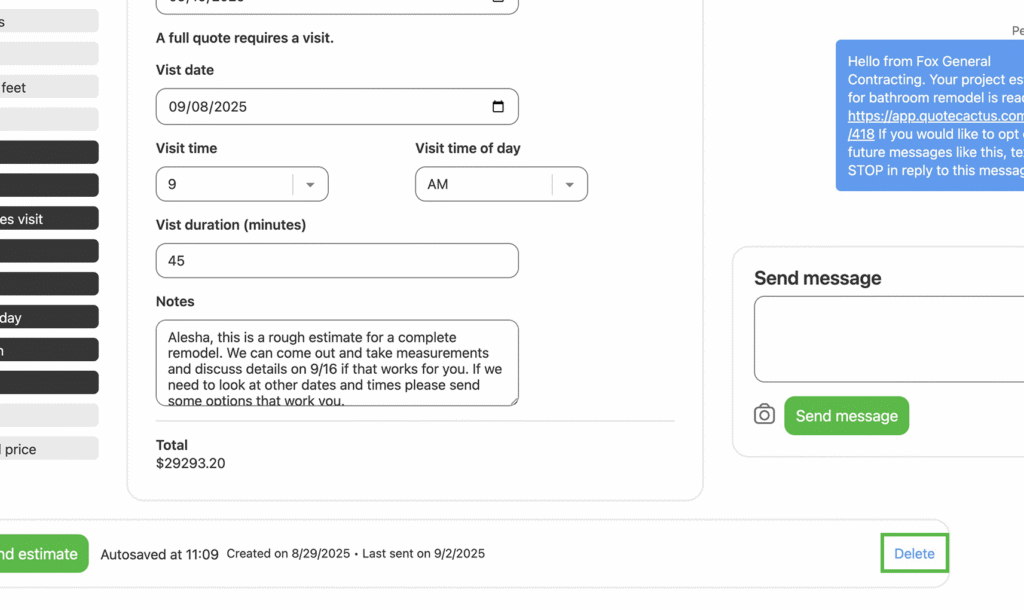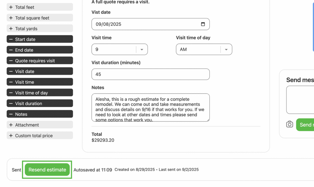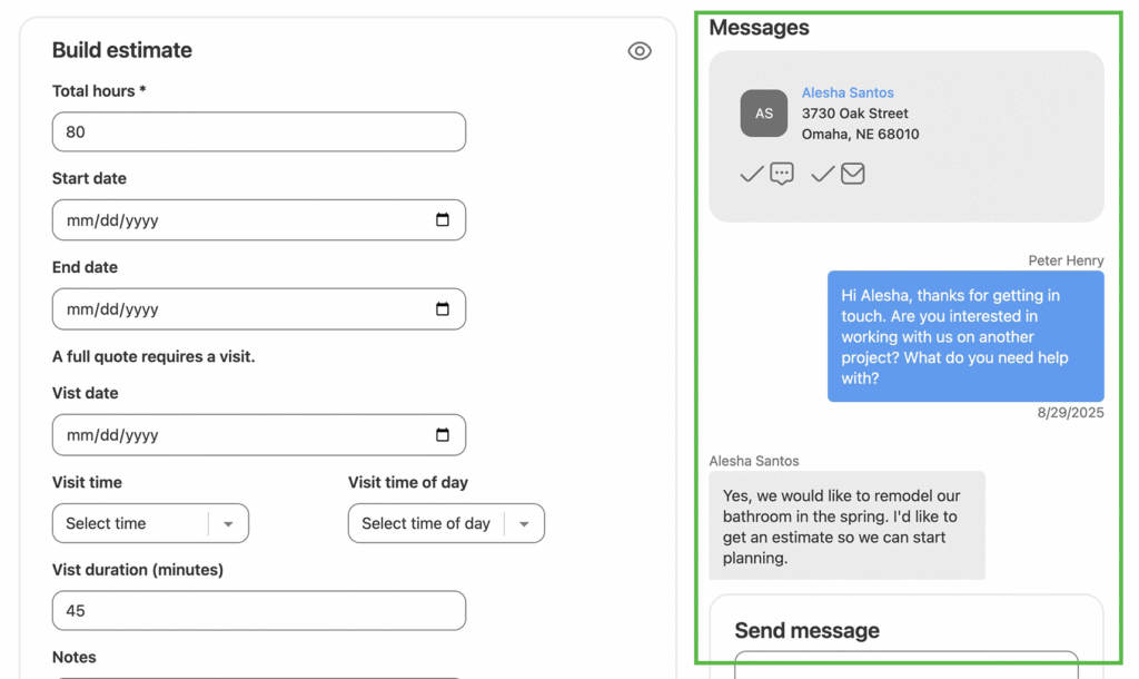 Use the Message column to communicate with prospects directly from the estimate page. This integrated messaging helps you ask clarifying questions, set up visit times, and maintain all communication in one central location.
