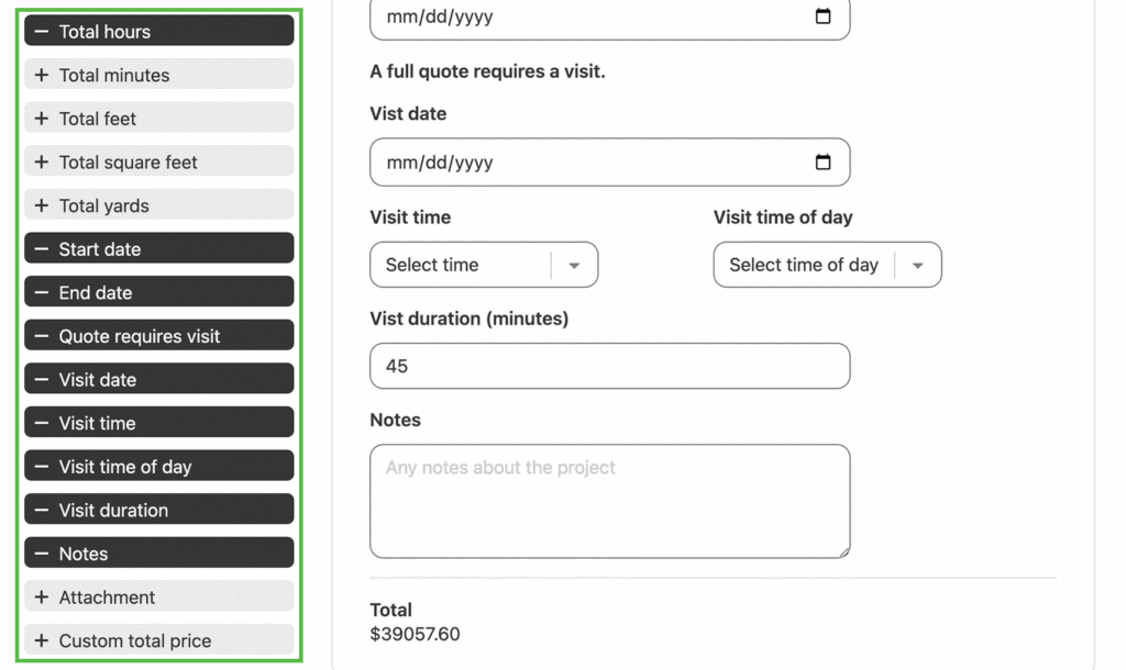 - Quote requires visit – Toggle on if you need to visit the site to build a detailed quote