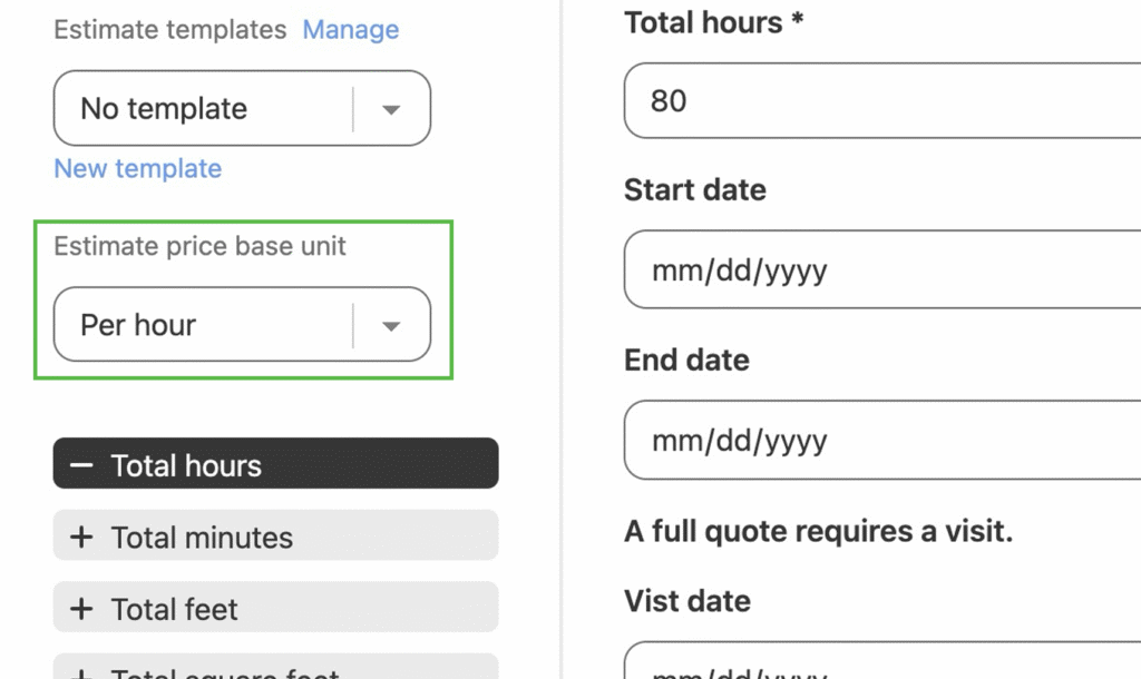 For example, if you want the estimate’s total price calculated based on the hourly rate assigned to the service, choose “Per hour.” If the service has a custom price base unit like “Per week,” you can select that option as well.