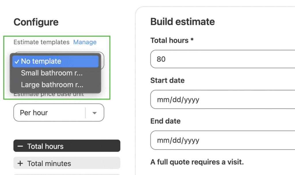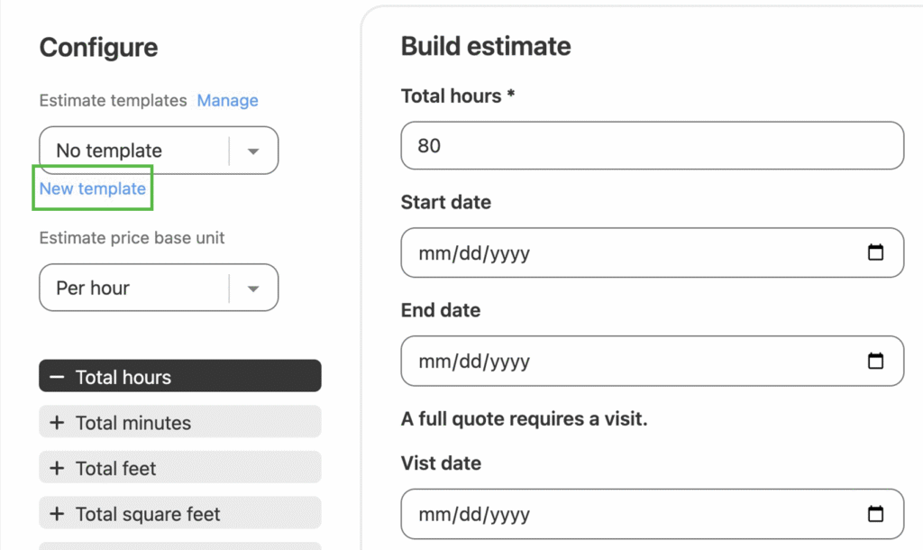 If you’ve created similar estimates before and saved them as templates, select one from the Estimate templates dropdown. Once selected, the estimate will be configured automatically based on the template settings.