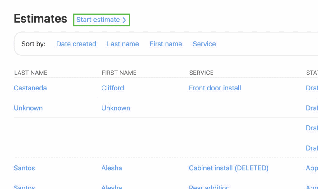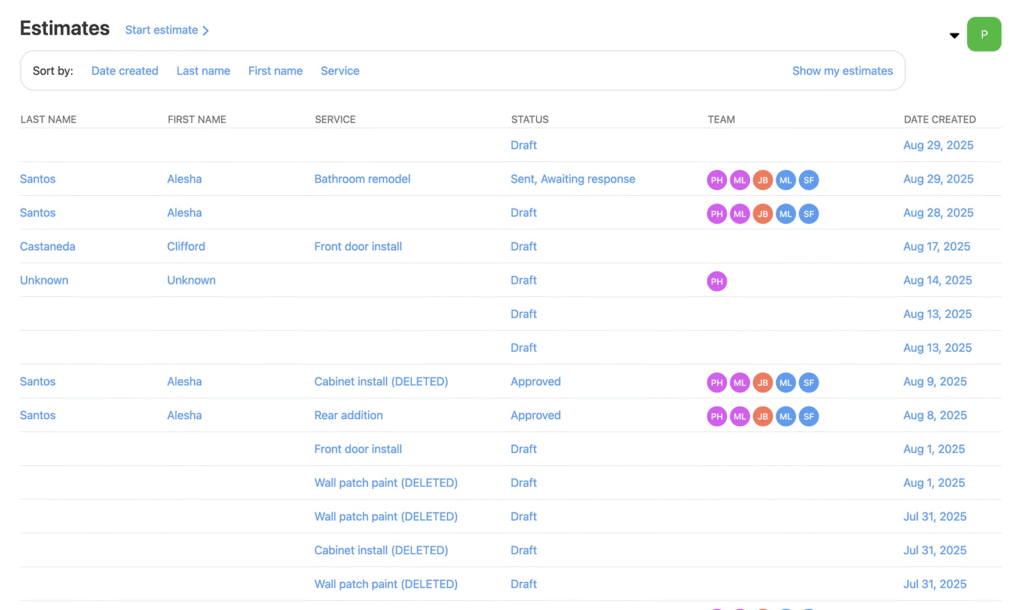 Access all estimates from the estimates page, which provides sorting options by Date Created, Last Name, First Name, and Service. Use “Show my estimates” to view only estimates for prospects assigned to you.