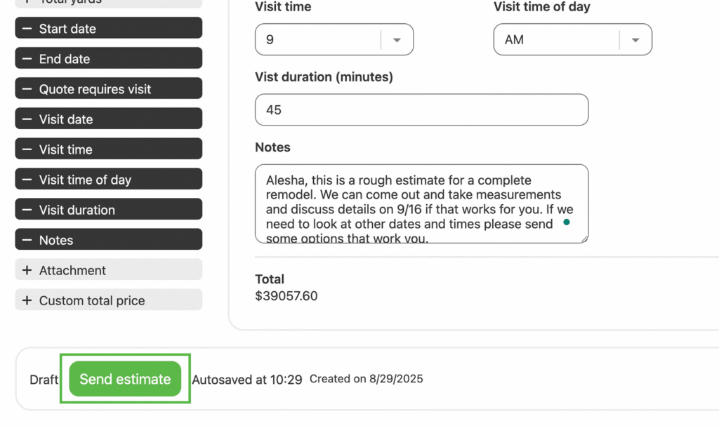 Important: Fields left empty will not appear on the final estimate sent to your prospect.