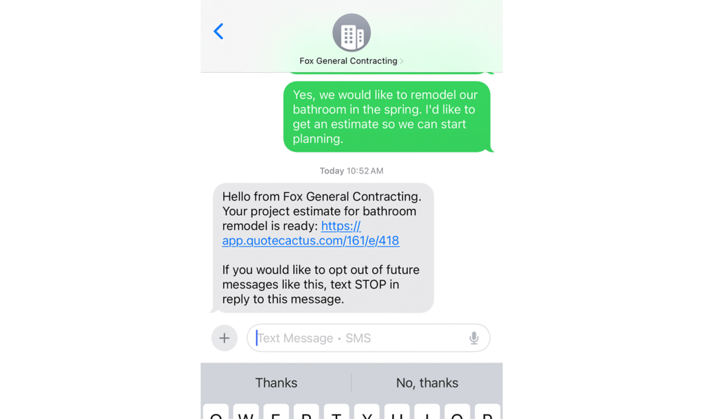 Once sent, prospects receive notifications via both text message and email that their estimate is ready. They can follow the link in the notification to view the estimate securely in your customer portal, where they can accept or reject it.