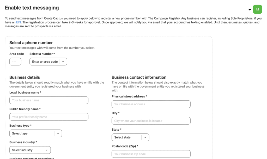 Important: Until you apply for and receive approval for text messaging, all estimates, quotes, and communications will be sent via email only.
