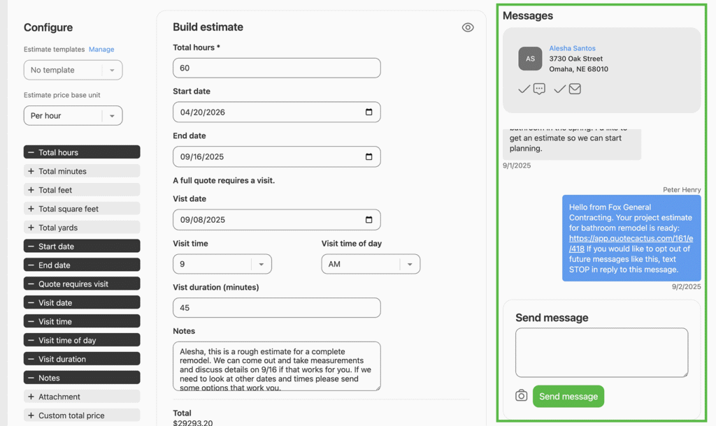 You send messages to your prospects from inside Quote Cactus using the integrated messaging interface. The platform provides a straightforward messaging system that maintains all communication history in one accessible location.