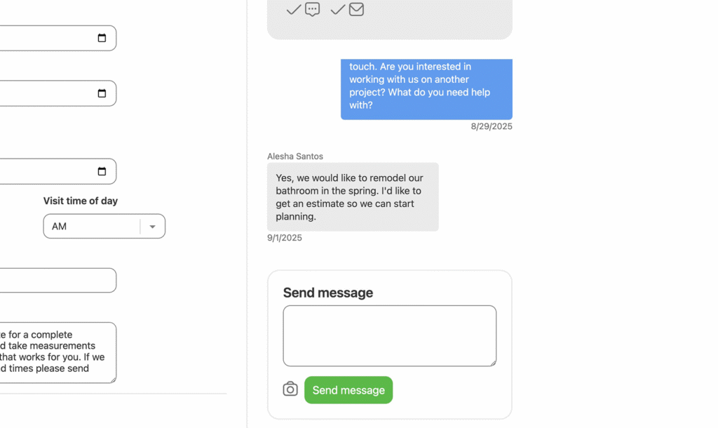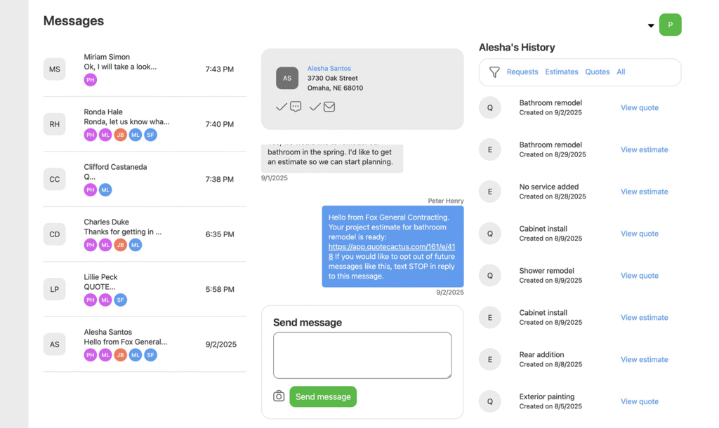 The messaging feature keeps prospects engaged throughout the sales process, helping you maintain momentum from initial inquiry through project completion. By providing timely responses and regular communication, you stay more responsive than competitors who rely on scattered email chains or missed phone calls.