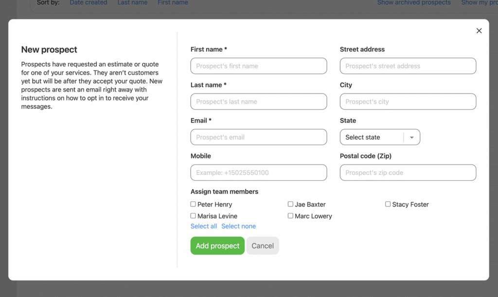 You can assign team members to the prospect during the creation process. This helps organize prospect management and ensures the right team member handles each customer relationship.